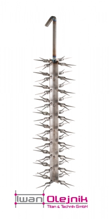 Typ: SG-FK Material: Titan Gr.4 federnd Stablänge: 750 mm oder nach Skizze Haken: nach Kundenwunsch Kontakt: Formklammer A Spitze: 2,00 mm Materialstärke: 1,57 mm Abstand: 25 mm oder nach Wunsch Abbildung: Stabgestell mit Formklammer A und Spitze 1,0 mm